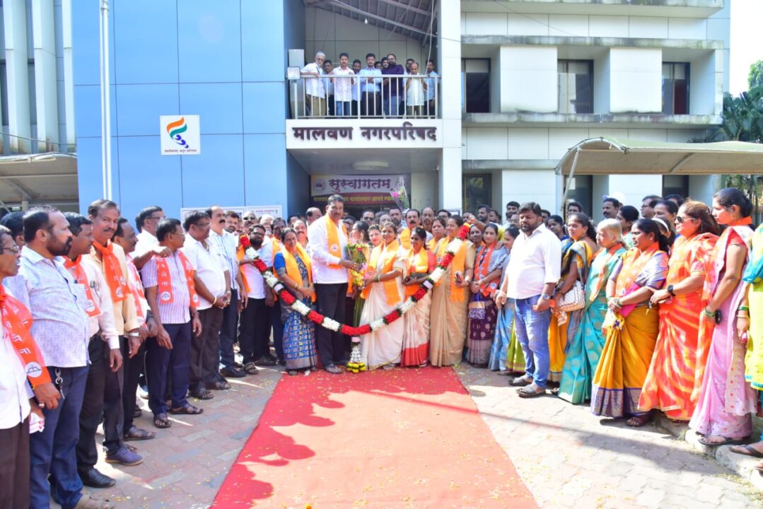 मालवण : प्रतिष्ठेच्या लढतीत मोठ्या बहुमताने निवडून आलेल्या मालवण नगरपरिषदेच्या पहिल्या लोकनियुक्त महिला नगराध्यक्ष शिवसेनेच्या सौ. ममता मनमोहन वराडकर यांनी शिवसेना जिल्हाप्रमुख दत्ता सामंत यांच्यासह शिवसेना नगरसेवक व पक्षाचे पदाधिकारी, कार्यकर्ते, प्रशासनातील कर्मचारी, नागरीक यांच्या उपस्थितीत गुरुवारी नगराध्यक्ष पदाचा पदभार स्वीकारला. नूतन नगराध्यक्षांचा पदभार सोहळा दिमाखात झाला. पुष्पवृष्टी व फटाक्यांच्या आतषबाजीत ममता वराडकर यांचे रेड कार्पेट घालून पालिकेत जल्लोषी स्वागत करण्यात आले. ममता वराडकर यांना शुभेच्छा व आशीर्वाद देण्यासाठी नागरिकही मोठया संख्येने नगरपरिषदेत उपस्थित होते.
