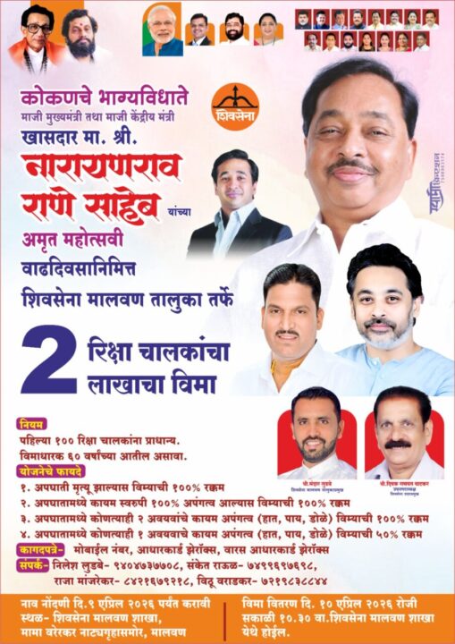 मालवण : कोकणचे भाग्यविधाते, माजी मुख्यमंत्री तथा माजी केंद्रीय मंत्री खासदार नारायण राणे यांच्या अमृत महोत्सवी वाढदिवसाचे औचित्य साधून मालवण तालुका शिवसेनेच्या वतीने रिक्षा चालकांचा २ लाख रुपयांचा विमा उतरण्यात येणार आहे.