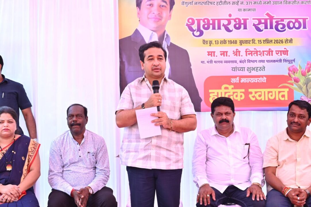 सिंधुदुर्गनगरी (जिमाका) वेंगुर्ला नगरपरिषद हद्दीतील भटवाडी येथे शासनाच्या वैशिष्ट्यपूर्ण योजनेअंतर्गत मंजूर झालेल्या ‘नमो उद्यान’ या महत्त्वाकांक्षी विकास कामाचा भूमिपूजन समारंभ पालकमंत्री नितेश राणे यांच्याहस्ते संपन्न झाला. वेंगुर्ला शहरात विकसित होणाऱ्या ‘नमो उद्याना’मुळे केवळ शहराचाच नाही तर सिंधुदुर्ग जिल्ह्याचा नावलौकीक होणार आहे. शासनाच्या वैशिष्ट्यपूर्ण योजनेअंतर्गत मंजूर झालेल्या या प्रकल्पामुळे स्थानिक पातळीवर रोजगार निर्मितीला चालना मिळण्याबरोबरच पर्यटनामध्ये देखील वाढ होणार आहे. म्हणून राज्यात आदर्श ठरेल असे दर्जेदार ‘नमो उद्यान’ साकारुन प्रथम क्रमांक मिळविण्याचे आवाहन पालकमंत्री नितेश राणे यांनी यावेळी बोलताना केले.